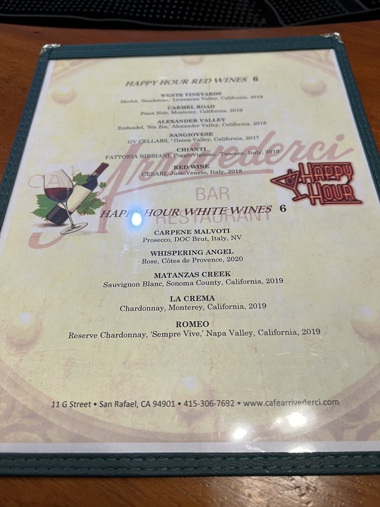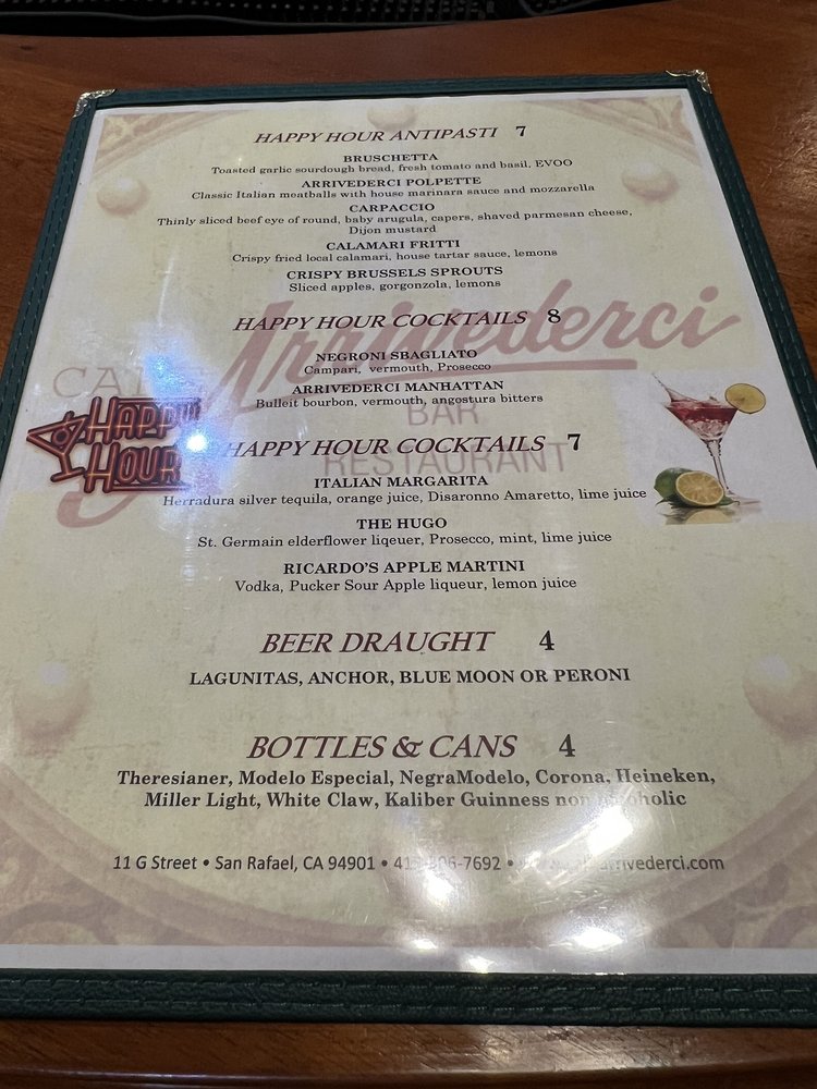 Café Arrivederci, located in San Rafael, CA, is a beloved Italian pizza restaurant with a diverse menu catering to various dietary needs including vegan and vegetarian options. The restaurant offers a range of amenities such as outdoor seating, free Wi-Fi, and a full bar. Customers praise the attentive service, delicious food, and enjoyable entertainment, including live music nights. Highlights include the French toast with mascarpone cream and berries for brunch, and the flavorful Bruschetta appetizer. The happy hour specials with a variety of drinks and dishes make it a popular choice for social gatherings. The welcoming atmosphere, friendly staff, and spacious layout make Café Arrivederci a hidden gem for dining experiences. Owner Ricardo and his team ensure a memorable visit, from intimate dinners to special events like wedding receptions or birthday celebrations. Plan your visit to savor the unique flavors and warm hospitality of Café Arrivederci.